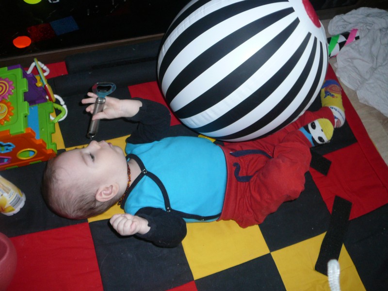Užívám si svátků co to jde, otáčím se na záda, takže na bříšku už nechci být, jen když rodiče dělají blbiny. Zkoušel jsem brýle, ale raději lepení okluzoru, alespoň prozatím "brýle zatím jen na hraní, když je někomu můžu vzít". Navštívili jsme celou rodinu a máme tu neteř se kterou sestřička dovádí. Zítra ale už odjíždí. Taťka si se mnou užívá hru s autíčkem a ještě musíme v týdnu navrtat zeď na hrátky s míčem.